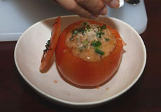・トマトの中を少しずつ皮を傷つけないようにスプーンでかき出す。