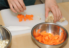 (1)人参は細かく切り、えのきは手で裂いておきます。